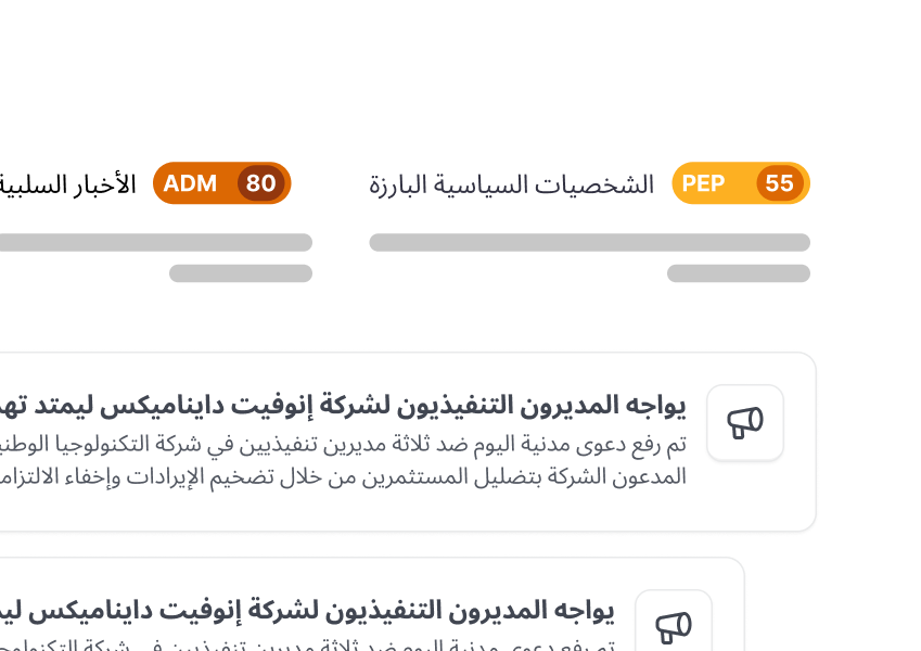 نحن نوفر للشركات مراقبة قوائم المراقبة العامة الدولية، والقوائم المحلية السعودية، والتقارير الإعلامية السلبية—كلها بسعر قائمة عامة واحدة لدى المنافسين.